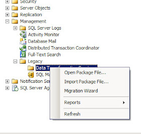 I am working on a project where in I had to analyse DTS packages and figure out the tables being exoprted/imported. The supported environment i have is only SQL Server 2005 and SQL Server 2008, so i needed way to open up DTS packages in SQL Server 2005. Microsoft has a tool SQLServer2005_DTS available for download in the MSDN site. Once this file is download and installed, one would have the ability to open DTS packages from Management Studio. Looka t the snapshot below: